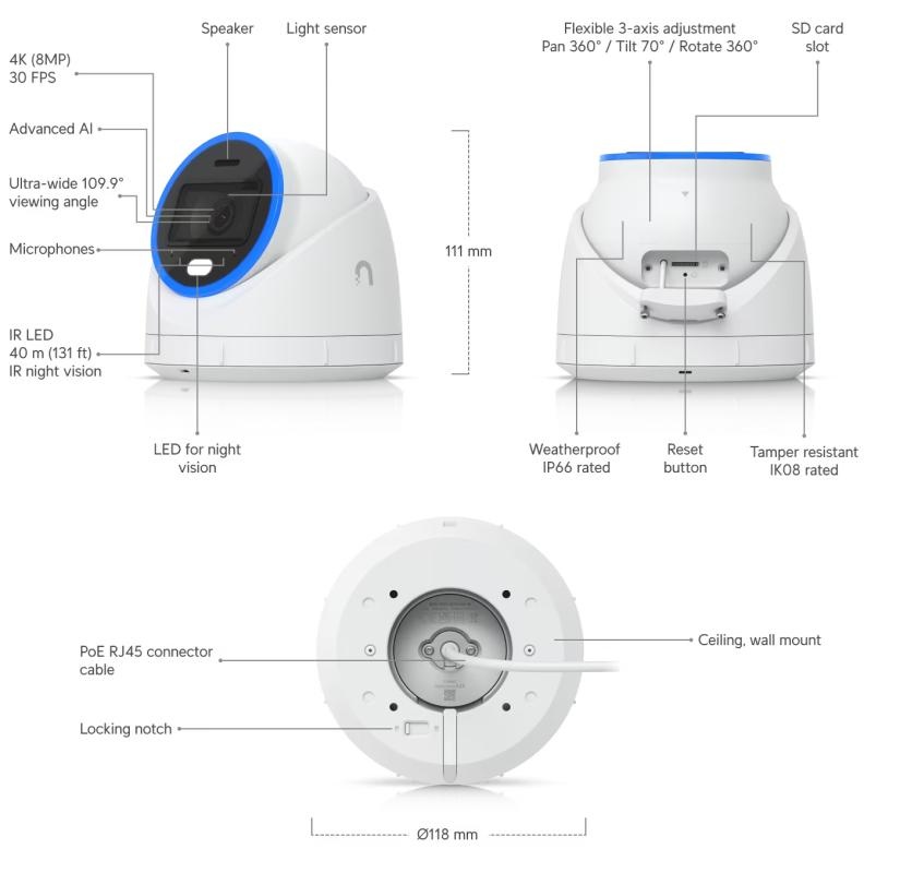 De AI Turret is bestand tegen zware omstandigheden en beschikt over een IP66-weerbestendige en IK08-vandaalbestendige aluminium behuizing, wat betrouwbaarheid garandeert in veeleisende buiteninstallaties. PoE+ connectiviteit vereenvoudigt de installatie en vermindert kabelwanorde, terwijl optionele ondersteuning voor microSD-kaarten flexibele mogelijkheden voor edge-opslag biedt. Naadloos beheerd via de UniFi Protect-webapplicatie of mobiele app, combineert de AI Turret krachtige technologie met intuïtieve bediening, waardoor het de ideale keuze is voor residentiële, commerciële of industriële bewaking.